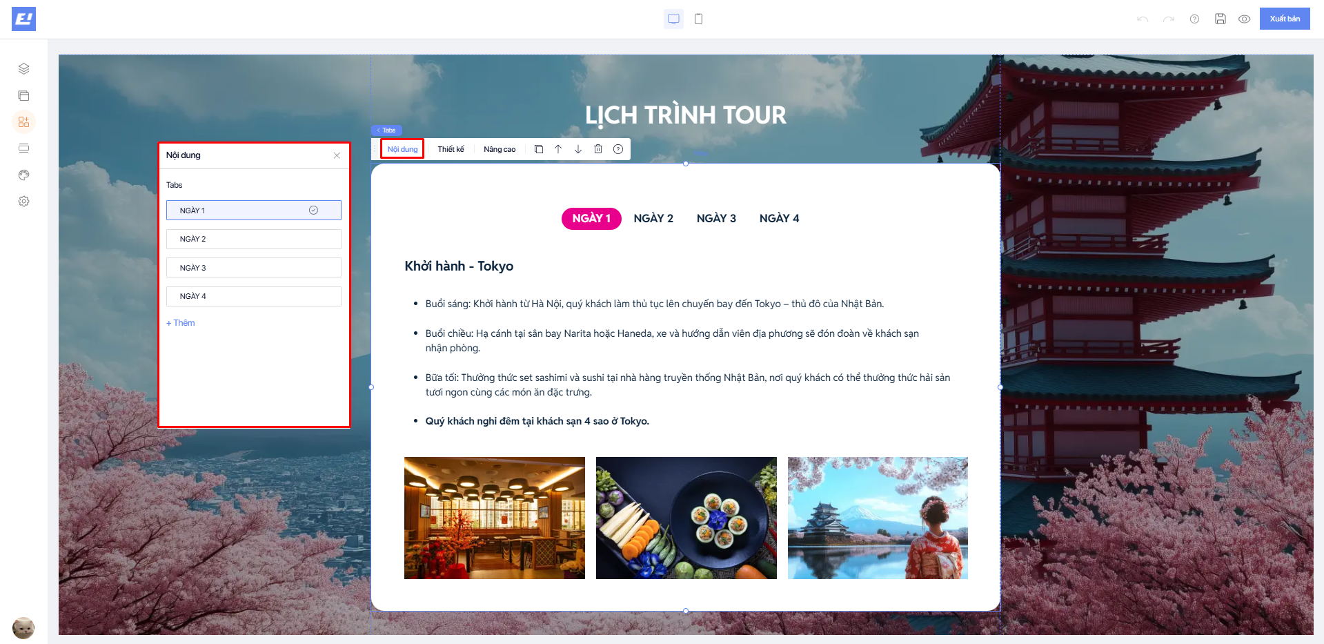 Để mở trình chỉnh sửa **Thiết kế,** bạn click vào tiện ích **Tabs** muốn chỉnh sửa trên màn hình ⇒ Chọn **Thiết kế** trên thanh thiết lập nhanh.