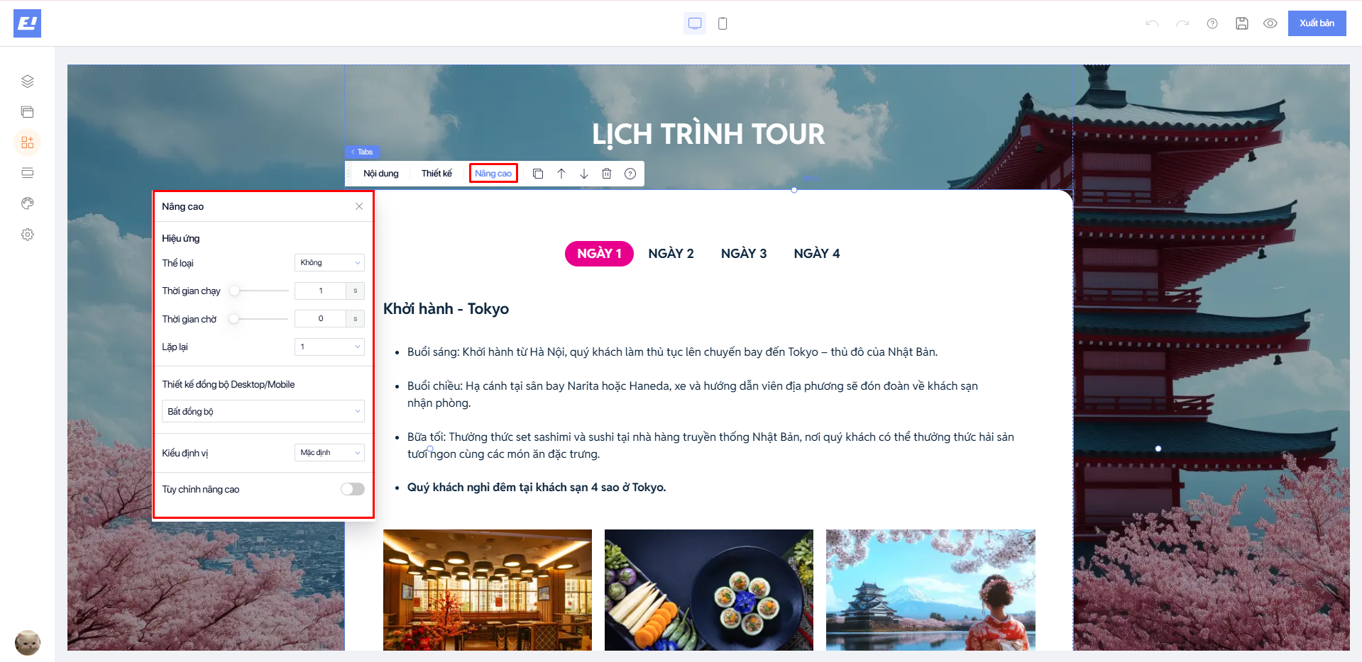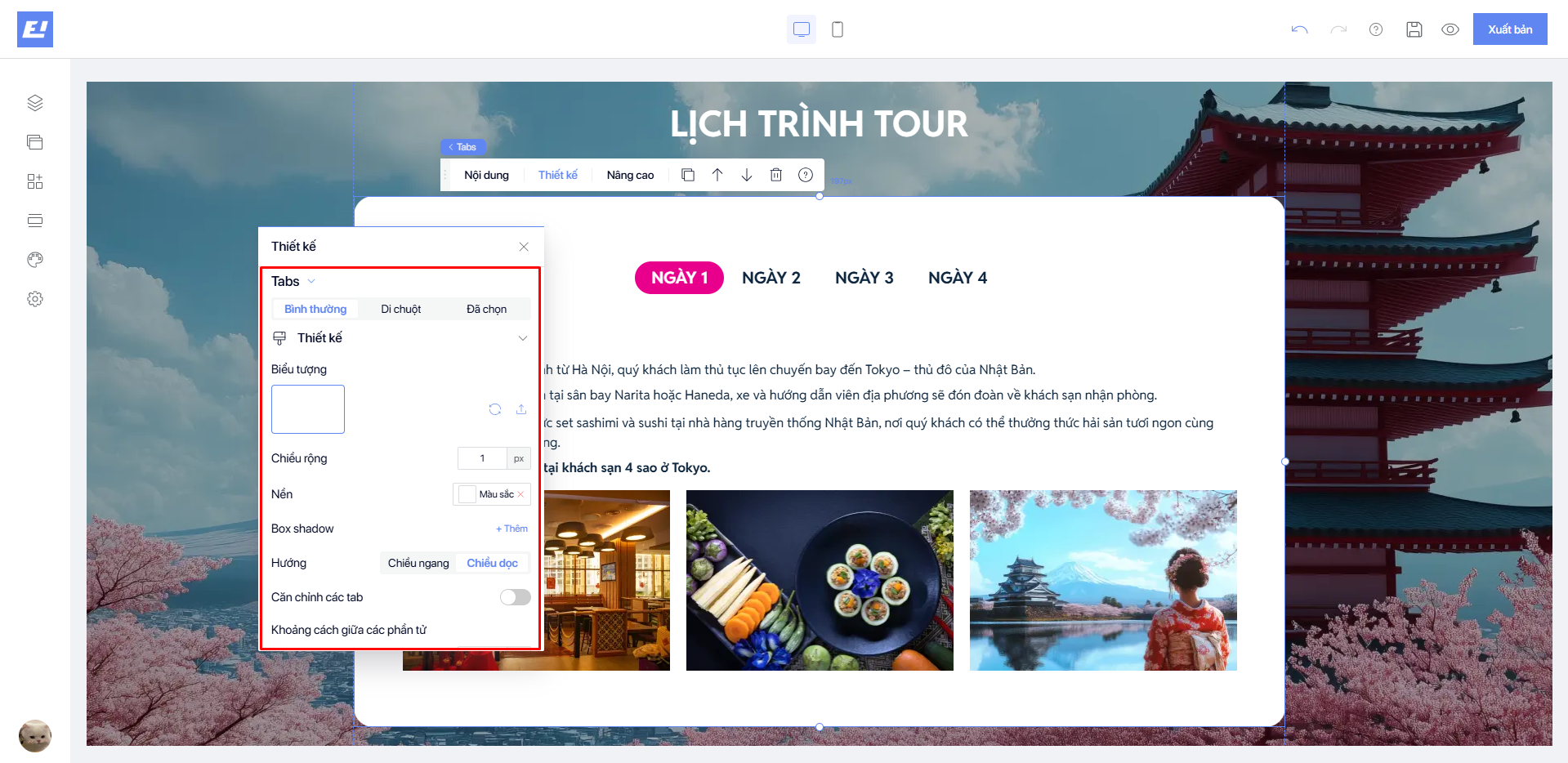 * Thiết kế Tab container cho phép người dùng tùy chỉnh cài đặt chung như: Căn chỉnh, Gap, Hướng hiển thị, Nền, Box shadow.