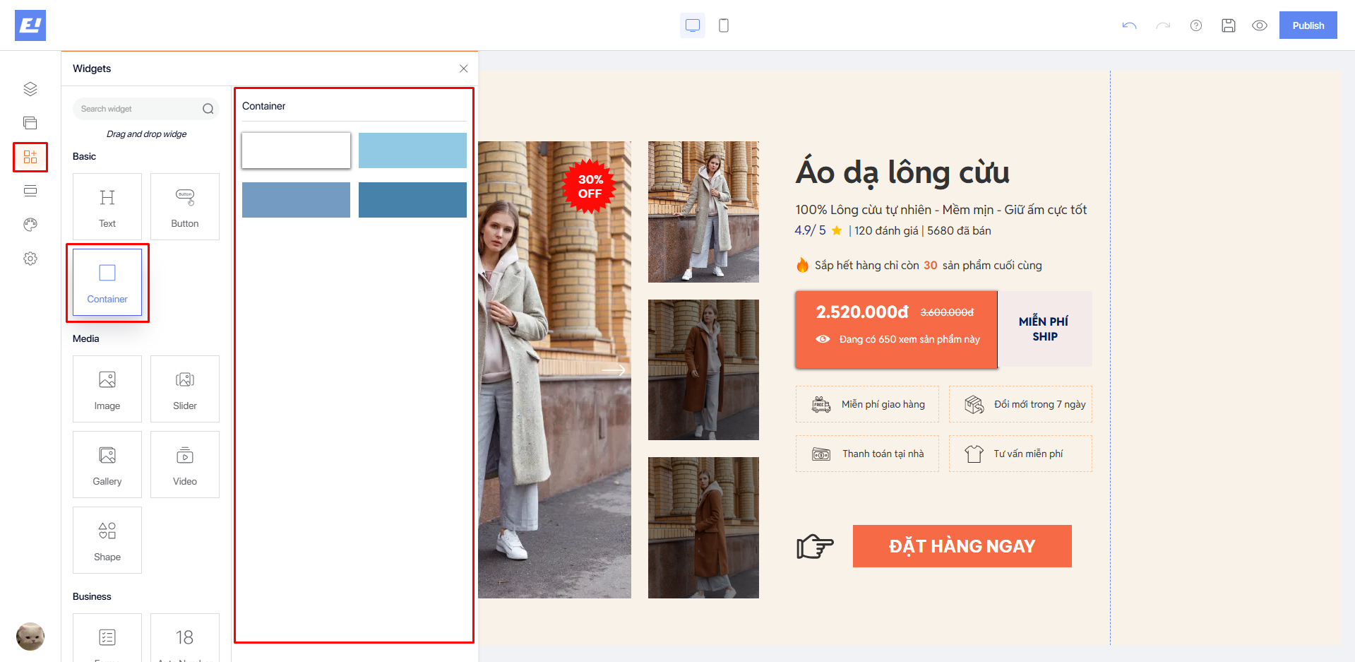 The **Container** widget is a useful tool that helps you easily create content boxes on the landing page. With the Box, you can create frames to contain text, images, videos, or any other elements you want to highlight on the page.