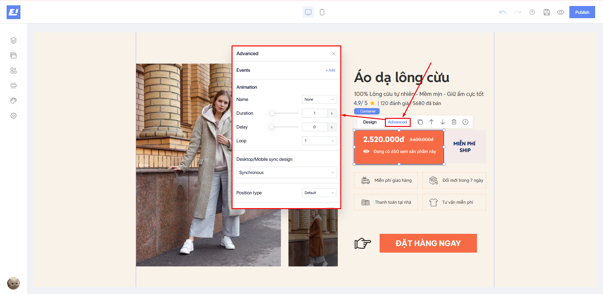 * **Desktop/Mobile sync design**: Allows you to set synchronization options for the design between desktop and mobile, see details [**here**](https://docs.shopone.io/english/basic-setup-tools-for-the-landing-page/quick-setup-bar/advanced-editor/desktop-mobile-sync-design).