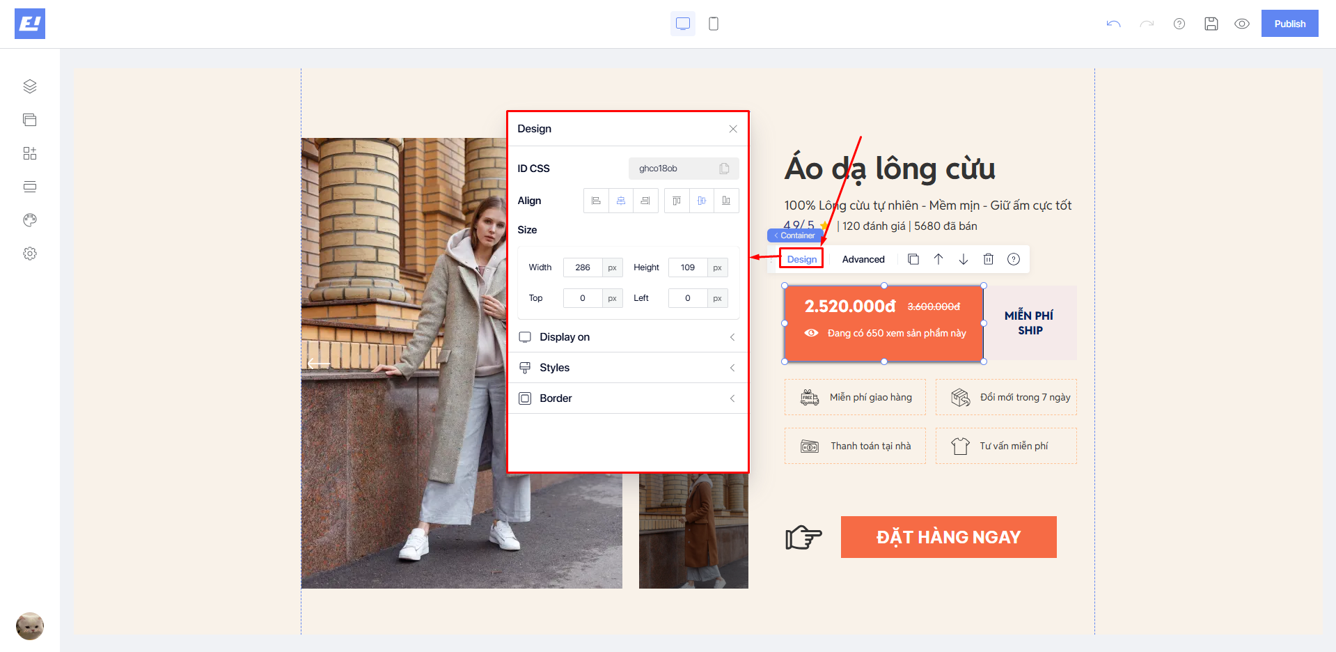 * **Sizes**: adjust the size of the **Container**, see details [<mark style="color:blue;">**here**</mark>](https://docs.shopone.io/english/basic-setup-tools-for-the-landing-page/quick-setup-bar/design-editor/size).