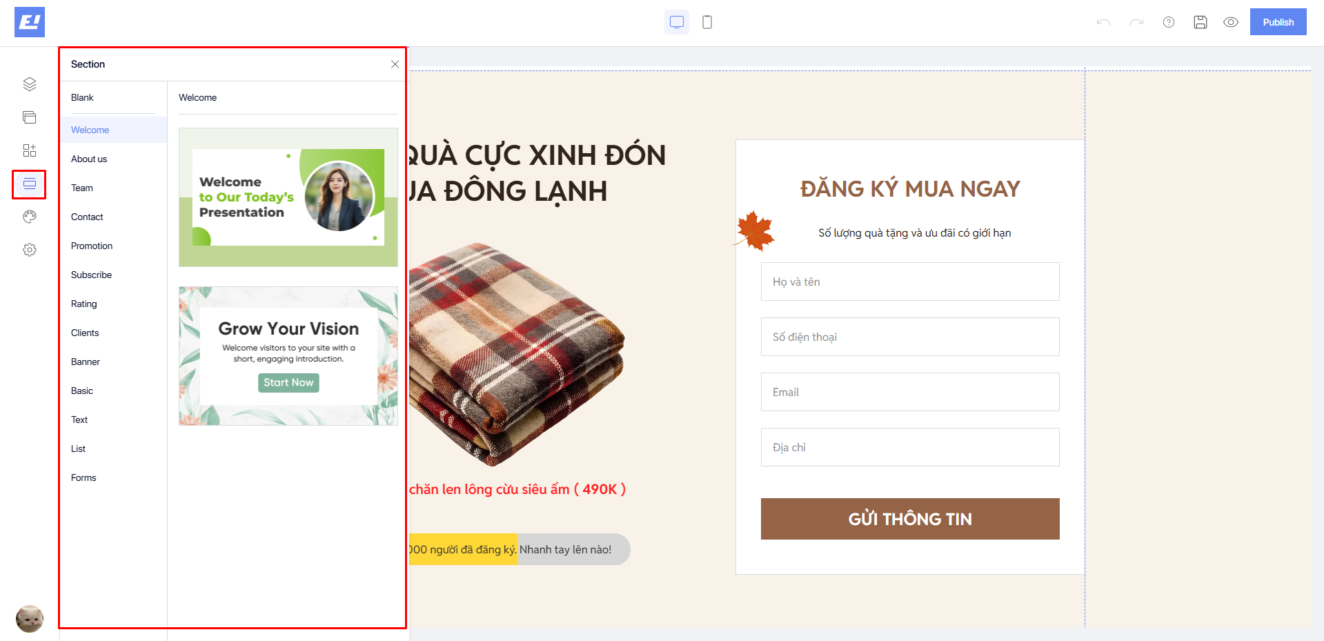**Section** is one of the essential components in the design process of a landing page. Each section is a distinct content block that helps organize the layout of the page in a visually coherent and logical manner.