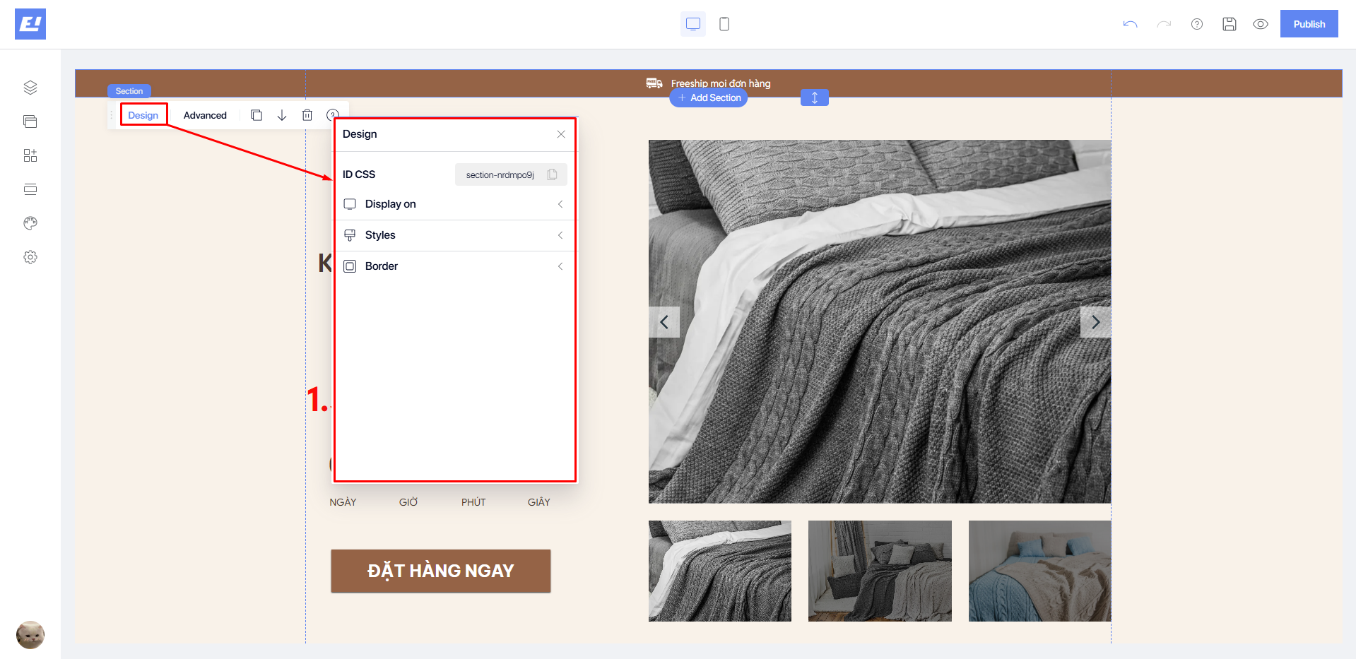 * **Border:** Allows you to add and customize the border around the section, and you can also adjust the roundness of the corners, see details [**here**](https://docs.shopone.io/english/basic-setup-tools-for-the-landing-page/quick-setup-bar/design-editor/border).