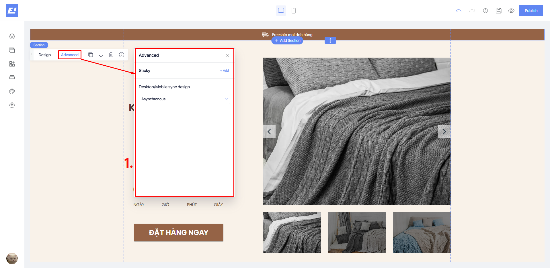 **Desktop/Mobile sync design**: Allows you to set synchronization options for the design between desktop and mobile, see details [**here**](https://docs.shopone.io/english/basic-setup-tools-for-the-landing-page/quick-setup-bar/advanced-editor/desktop-mobile-sync-design).