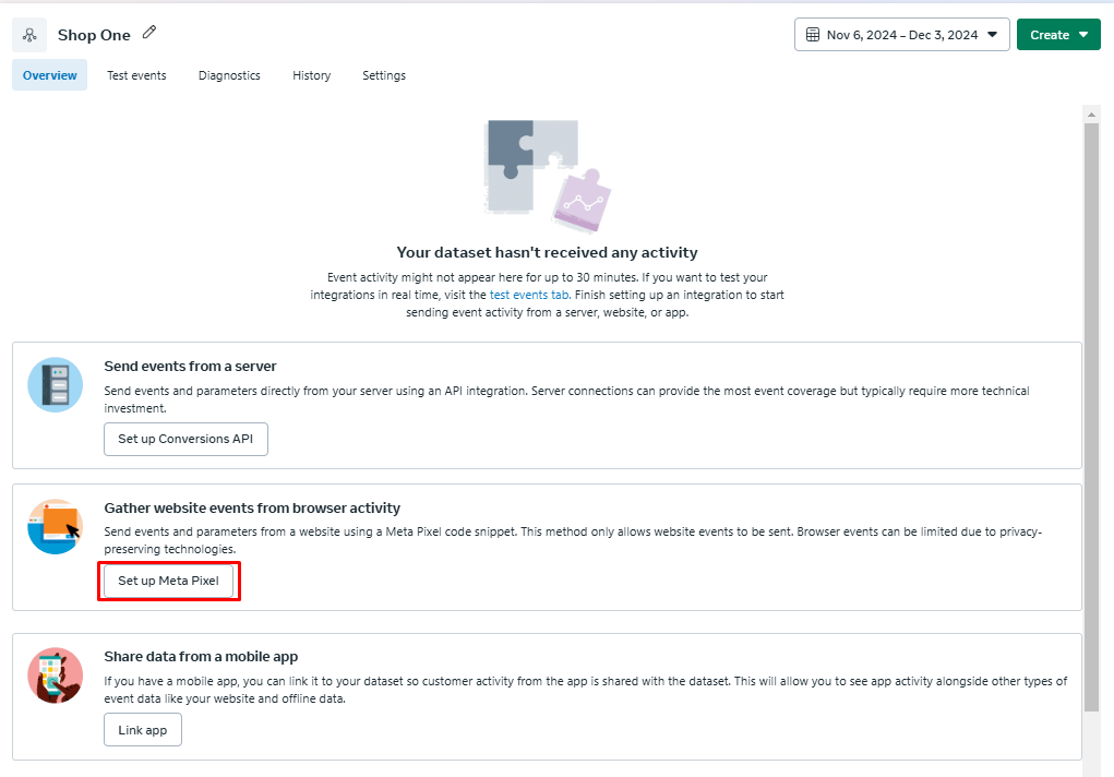 In the **Datasets** section, select the dataset you just created → **Open in Events Manager.**