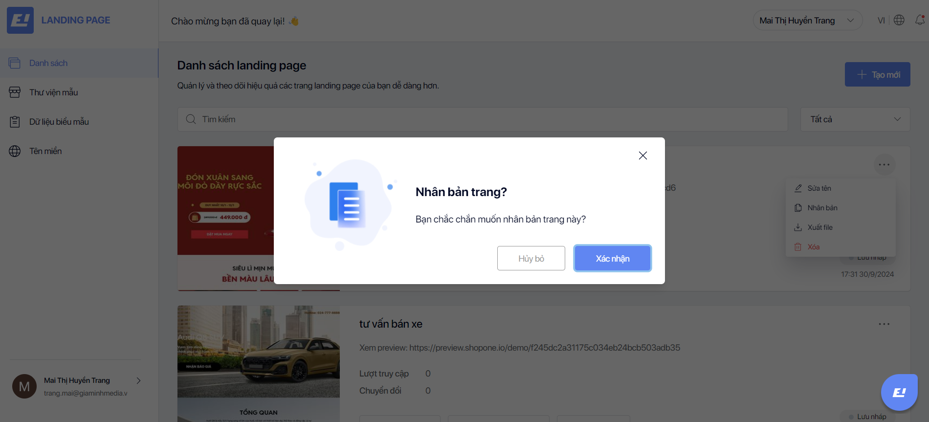 Chức năng **nhân bản** cho phép bạn tạo ra 1 bản sao của landing page hiện có trên trang web. Điều này rất hữu ích khi bạn muốn tạo ra nhiều phiên bản của một sản phẩm với các biến thể khác nhau mà không cần phải nhập thông tin từ đầu.