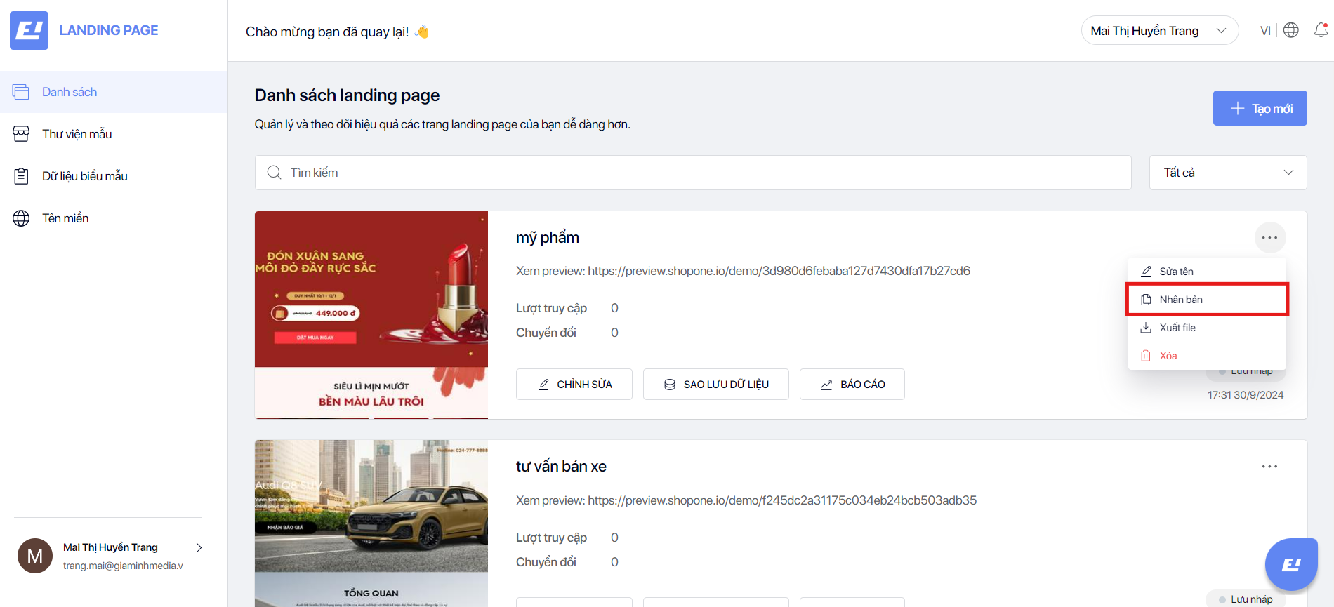 Nhấp vào biểu tượng xem thêm của landing page cần nhân bản, sau đó nhấp vào **Nhân bản** để nhân bản landing page.