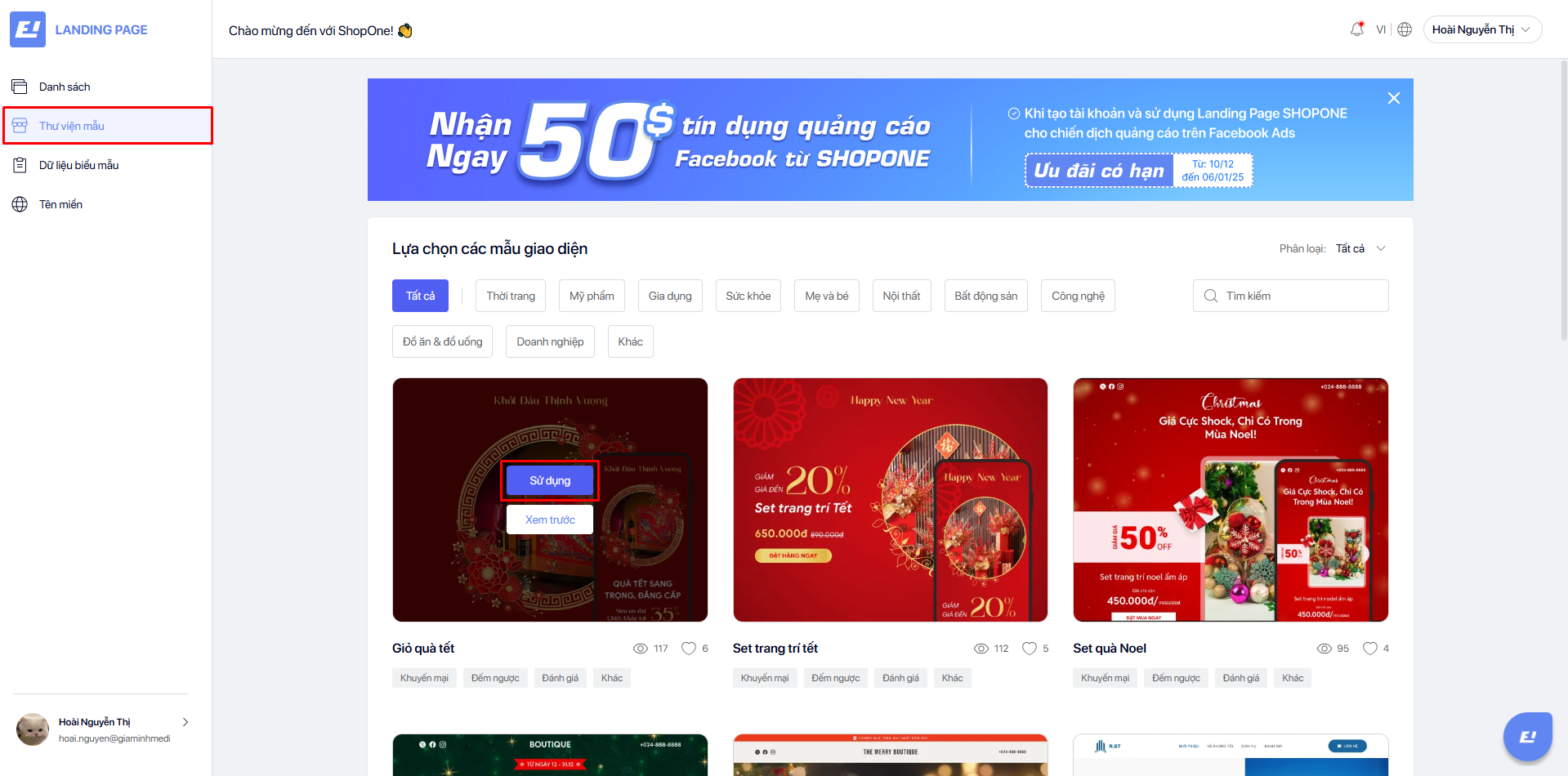 Tại đây, bạn có thể tìm kiếm landing page theo từ khóa bạn mong muốn, hoặc thông qua gợi ý của ShopOne. Bạn có thể sử dụng landing page bằng việc nhấp vào **Sử dụng** để truy cập vào trang chỉnh sửa và bắt đầu chỉnh sửa, hoặc nhấp vào **Xem trước** để xem toàn bộ landing page trước khi sử dụng.